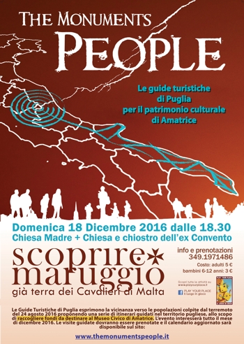 People”: il mese di dicembre sarà caratterizzato, in Puglia, da una serie di visite guidate al fine di raccogliere dei fondi da destinare al restauro di alcune opere del museo di Amatrice. Anche Maruggio, attraverso l’associazione “Play your Place”, ha deciso di partecipare a questa gara di solidarietà per sostenere il recupero delle opere artistiche danneggiate dal terremoto dello scorso agosto che ha colpito il Centro Italia.