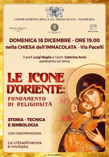 prossima, alle 19, nella chiesa dell’Immacolata. In questa iniziativa, promossa dalla Confraternita dell’Immacolata di Manduria (in collaborazione con la biblioteca diocesana “Kalefati” di Oria, la Società di Storia Patria per la Puglia e la Diocesi di Oria), il prof. Luigi Neglia e l’arch. Caterina Arnò si soffermeranno sulla storia, delle tecniche di realizzazione e sulla simbologia delle icone d’oriente.