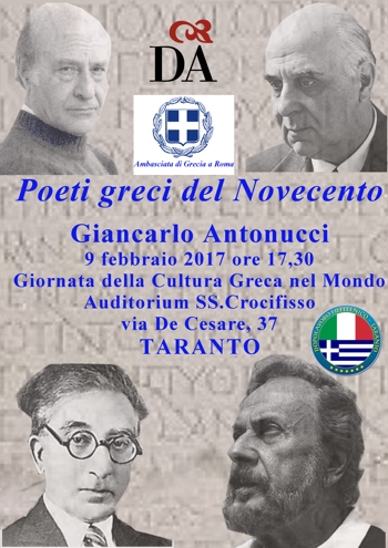 A Taranto l’associazione culturale Dopolavoro Filellenico ha aderito e promosso l’iniziativa, e in collaborazione con la sezione locale della Società Dante Alighieri, presieduta dalla prof.ssa José Minervini, terrà una conferenza sui poeti greci del Novecento. Ne parlerà il presidente del Dopolavoro Filellenico, prof. Giancarlo Antonucci, il prossimo 9 febbraio alle ore 17,30 presso l’auditorium della parrocchia SS. Crocifisso in via De Cesare.