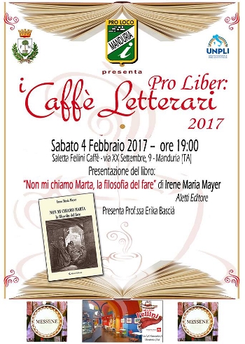 L’incontro sarà presentato dalla professoressa Erika Bascià e, come consuetudine dei caffè letterari, non mancheranno caffè e pasticcini offerti dalla Pro Loco di Manduria. Ciascuno dei presenti potrà quindi contribuire con le proprie riflessioni ad arricchire il dibattito.