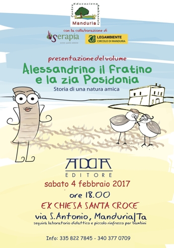 di Educazione Ambientale e dal circolo di Manduria di Legambiente. Questa sera, alle 18, presso la chiesetta della Santissima Croce (è nell’area del parco archeologico), sarà presentato, in collaborazione con la cooperativa Serapia di Ostuni, il volume “Alessandrino il fratino e la zia Poseidonia, storia di una natura amica” di Marialucrezia Colucci (il libro è edito da Adda).