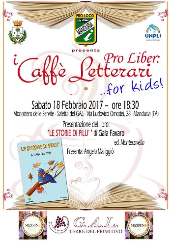 ricomincerà nel pomeriggio di sabato 18 Febbraio 2017 alle ore 18.30 presso la saletta del GAL (Monastero delle Servite – via Ludovico Omodei 28, Manduria) con la presentazione del libro “Le storie di Pilù” di Gaia Favaro edito da Montecovello. L’autrice ci racconta:“Il desiderio di dedicarsi alla scrittura per l’infanzia e per i ragazzi, ha origini lontane. Un profondo interesse per questo genere mi ha spinto, negli anni, ad approfondire il mio bagaglio culturale e mi ha indirizzato verso un’attenta lettura e ricerca.