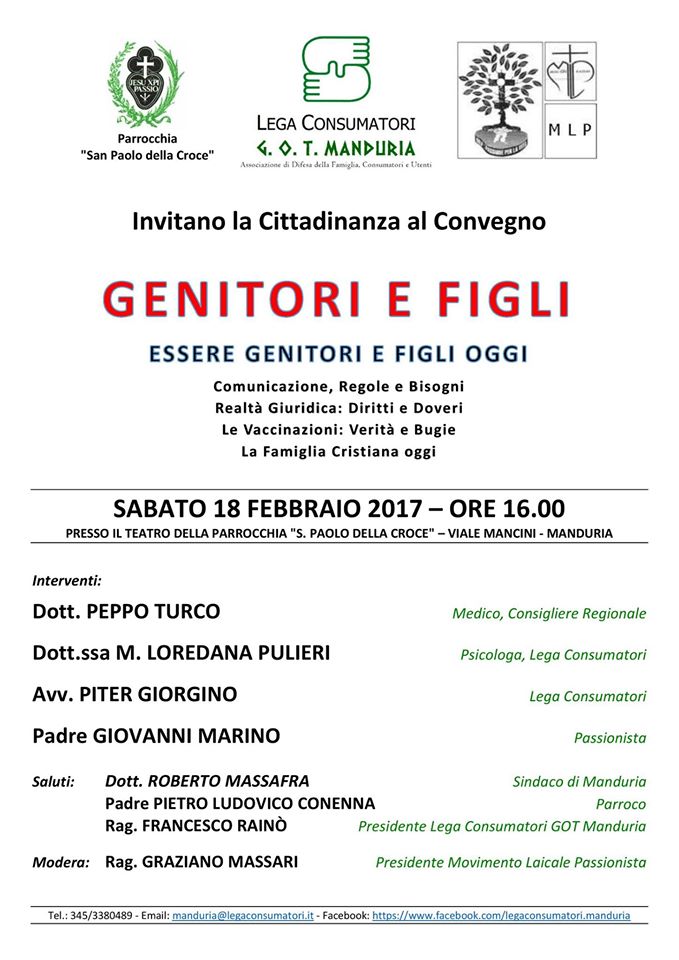 Manduria, ha in programma per questa sera, alle ore 16, presso una sala della parrocchia San Paolo della Croce di Manduria, il convegno “Genitori e Figli: Essere Genitori e Figli Oggi” il cui scopo è capire le trasformazioni di questi ruoli nel nuovo e moderno contesto sociale.