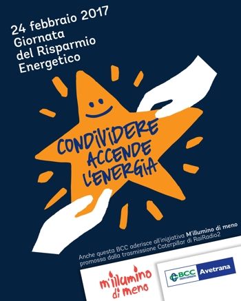 Seguendo i suggerimenti di Caterpillar, che punta sulla tematica della condivisione quale possibile veicolo di risparmio energetico, la BCC di Avetrana promuoverà sul territorio l'iniziativa "Condividere accende l'energia", disattivando alcuni dispositivi (stampanti e calcolatrici) e spegnendo alcuni neon nelle filiali di Avetrana, Manduria, Maruggio e Sava. Inoltre, saranno distribuite al pubblico copie del “Decalogo del Risparmio Energetico”.