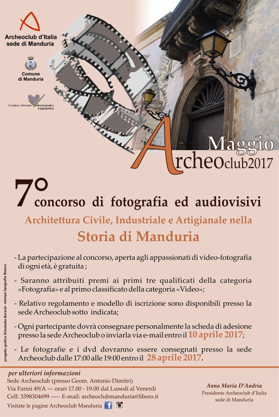 Manduria”.E’ questo il tema della settima edizione del concorso video-fotografico che la sezione di Manduria di “Archeoclub d’Italia” promuove nell’ambito del “Maggio Archeoclub 2017”. Anche quest’anno, infatti, tutto il materiale che i concorrenti faranno pervenire ad Archeoclub sarà esposto all’interno dei palazzi storici nell’ambito della collaudata iniziativa “Androni aperti”.