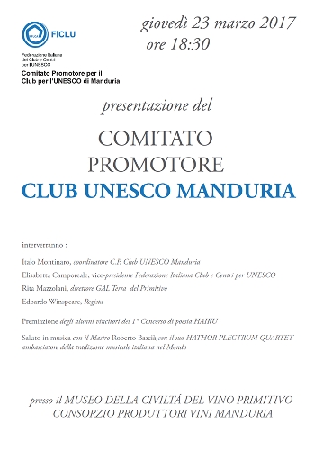 La cerimonia di giovedì sarà aperta dall’intervento di Italo Montinaro, coordinatore del comitato promotore del Club per l’U.N.E.S.C.O. di Manduria: «I “perché” di un Club per l’U.N.E.S.C.O» sarà il tema della sua relazione.