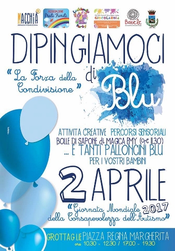 convivono con questo disturbo e si confrontano con tantissime difficoltà legate soprattutto a stereotipi e pregiudizi che minano la serenità e le opportunità di sviluppo delle persone autistiche. Nonostante ciò non ci sono dubbi sul fatto che il disturbo dello spettro autistico sia fra i più complessi da trattare e per il quale si richiedono conoscenze e competenze da parte di tutti.Per l'occasione anche Grottaglie si mobilita con un evento in piazza Regina Margherita dal nome fortemente identificativo "Dipingiamociblu" che nasce dalla volontà di sensibilizzare la cittadinanza e dimostrare le opportunità di inclusione offerte anche da giochi e attività messe in campo da vari enti del territorio grottagliese: le associazioni Macchià, Prati Fioriti e Babele, la cooperativa Giocolandia e la ludoteca Ludolandia.