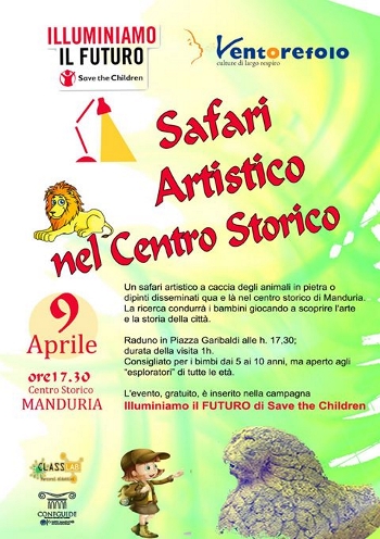 aderisce alla Campagna “Illuminiamo il Futuro”, indetta da Save The Children per sensibilizzare l’opinione pubblica sul tema della povertà educativa. Per l’occasione, Vento Refolo organizza l’evento Safari artistico nel centro storico, che si terrà a Manduria domani.