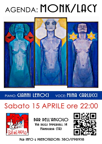 secondo. Due leggendari e autentici monumenti della storia del jazz, due artisti semplicemente geniali, dall’inestimabile valore, che hanno influenzato una pletora di jazzisti odierni. Sabato 15 aprile, alle ore 22:00, presso il bar dell’Angolo (Via degli Imperiali, 14 – Manduria) di Carmelo Massafra, la cantante Mina Carlucci e il pianista Gianni Lenoci renderanno omaggio a questi due giganti con un progetto intitolato Agenda: Monk / Lacy, attraverso alcune perle compositive, riarrangiate ad hoc, autografate dai due musicisti statunitensi.