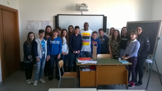 Stephane Coquin, 34 anni, ha incontrato i ragazzi della scuola media di Avetrana. Per tanti di loro, che seguono ogni domenica capitan Gioia e soci, è diventato un idolo.
