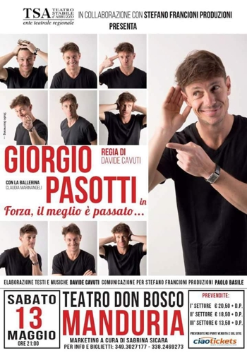 andrà in scena “Forza, il meglio è passato...”, uno spettacolo con Giorgio Pasotti, scritto e diretto dal musicista Davide Cavuti, frutto della collaborazione del Tsa (Teatro stabile d’Abruzzo) con la Stefano Francioni Produzioni.“Forza, il meglio è passato...”, racconta Cavuti, “attraversa la storia di alcuni personaggi del teatro e della letteratura e le varie epoche in cui hanno preso forma, cogliendo gli aspetti della vita dell’uomo quali l’essere, l’apparire, l’amore, il futuro. Le innumerevoli contraddizioni dell’individuo, di come dover vivere le ingiustizie, i dolori, il destino saranno messi in scena con ironia e anche con una profonda analisi dell’umano sentire in rapporto alle problematicità della vita quotidiana. Il messaggio di difesa della vita, che va assaporata nella sua beatitudine e ammirata nella sua bellezza, sarà il tema della seconda parte dello spettacolo intriso di tragico e umoristico. Ma anche momenti di danza che proietteranno gli spettatori nei vari quadri che compongono lo spettacolo grazie ai virtuosismi di Claudia Marinangeli”.