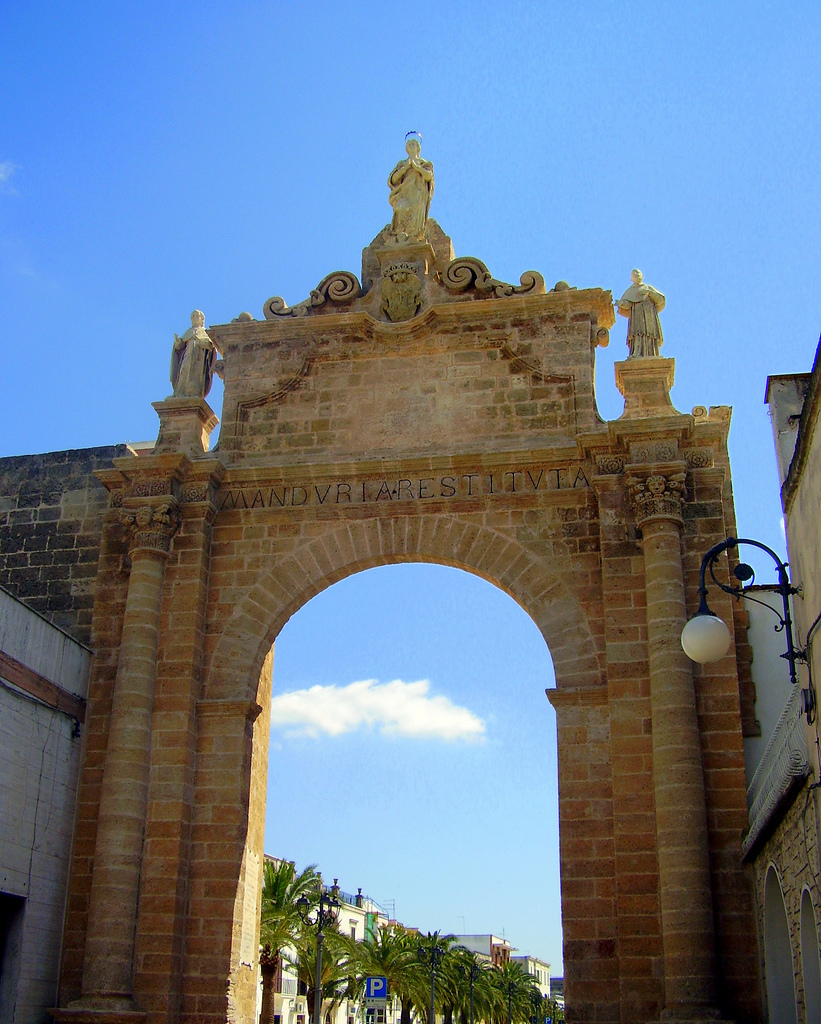 A Manduria, la stessa collocazione aveva trovato -nonostante la costruzione fosse molto più antica (risalendo probabilmente al secolo XVII)- l’Arco S.Angelo (o Porta Napoli), che era stato posto, appunto, all’entrata della città per chi proveniva dalla direzione Taranto-Napoli.