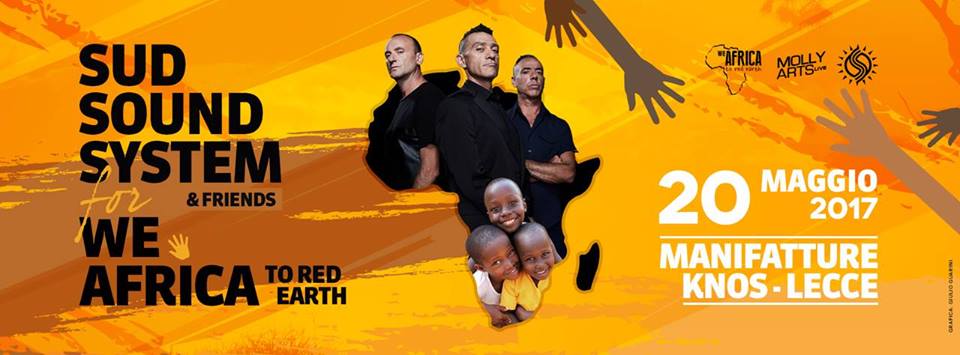 Sabato 20 maggio si terrà presso le Manifatture Knos di Lecce l’evento “Sud Sound System for We Africa” organizzato da Sud Sound System e Molly Arts per sostenere l'associazione We Africa to Red Earth che da tre anni opera con la mission di fornire alle popolazioni del Burkina Faso quanto necessario per vivere in condizioni dignitose.