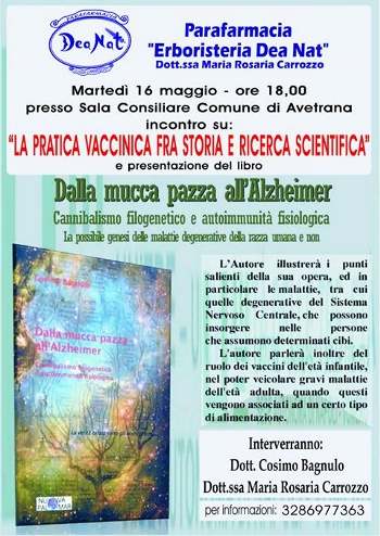 con contraddittorio sulla validità vaccinale, argomento oltremodo attuale e scottante.Il dott Cosimo Bagnulo, uno dei due relatori, illustrerà le sue ricerche trentennali sull’azione scientifica dei vaccini sul nostro sistema immunitario e soprattutto in quello dei bambini. Dalle sue ricerche è scaturito il libro “Dalla mucca pazza all’Alzheimer”.