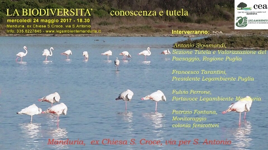 Il Circolo Legambiente di Manduria, organizza per domani (mercoledì 24 maggio), alle ore 18,30 presso la ex chiesa Santa Croce, in via Sant’Antonio, nei pressi del parco archeologico una conferenza sul tema “Biodiversità: conoscenza e tutela”.