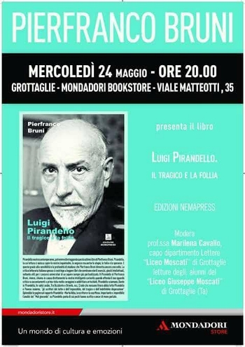 Infatti mercoledì 24 maggio alla Libreria Mondadori di Grottaglie ore 20 sarà la prof.ssa Marilena Cavallo, Capo dipartimento Lettere del Liceo Moscati di Grottaglie, a introdurre e moderare l'intervento di Piefranco Bruni. Seguiranno letture da parte degli alunni dello stesso liceo Moscati, il quale è stato un Istituto d’avanguardia proprio nella promozione degli studi su Pirandello con una serie di interventi e di partecipazione ai momenti celebrativi pirandelliani.