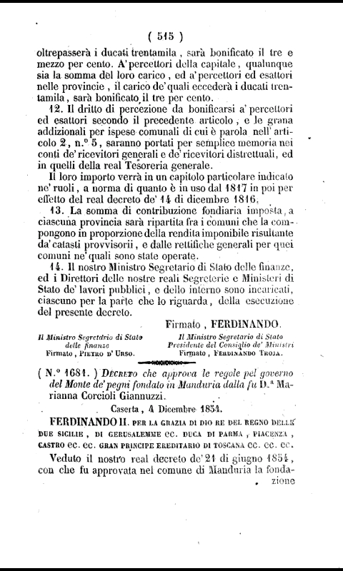 Ma, benchè la volontà di erigere il monte di pegni fosse stata manifestata da Marianna Giannuzzi già nel testamento del 1796, per la sua attuazione concreta (o, se non altro, ufficiale) fu necessario attendere il decreto istitutivo del 21 Giugno 1854 di Ferdinando IV delle Due Sicilie, cui seguì un altro regio decreto il 4 Dicembre dello stesso anno (il n.1684) per l’approvazione del regolamento (3).