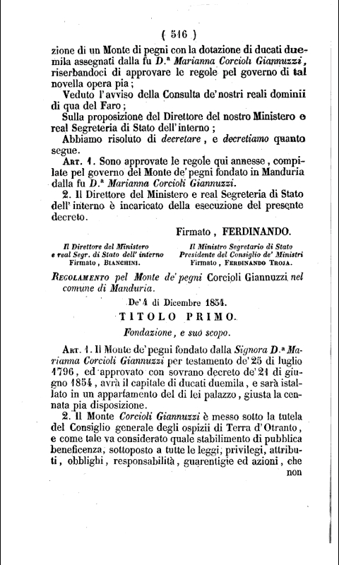 del Monte di Pietà (che nel 1993, al momento della soppressione, era denominato Opera Pia Ente Monte di Misericordia)- reca, infatti, l’intitolazione “Decreto che approva le regole pel governo del Monte de’ pegni fondato in Manduria dalla fu D.a Marianna Corcioli Giannuzzi”,e contiene, nella parte iniziale, l’approvazione del regolamento steso in calce.
