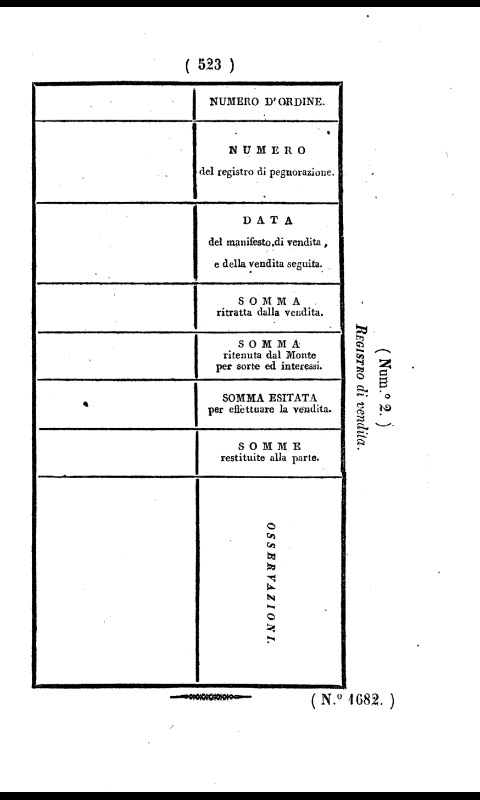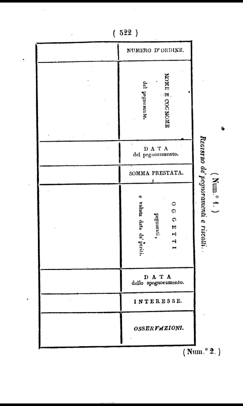 Inoltre era prevista la tenuta di due registri “uno per la pegnorazione e pel riscatto de’ pegni” e “l’altro per la vendita degli oggetti non riscattati”. I due registri dovevano corrispondere ai due modelli allegati allo stesso regolamento (e al regio decreto) con i numeri 1 e 2 (vedi immagini).