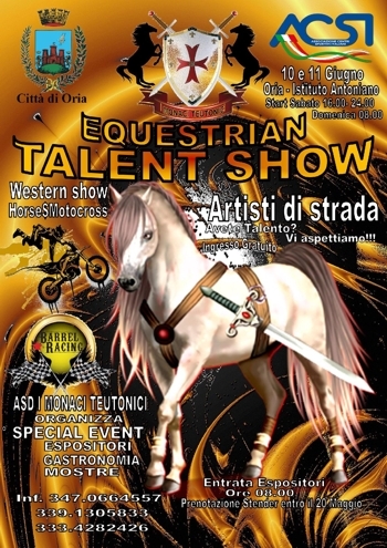 esclusiva regionale, dell’Equestrian Talent Show, l’evento dedicato a cavalli e cavalieri che si svolgerà sabato 10 e domenica 11 giugno presso l’Istituto Antoniano.L’appuntamento, organizzato dall’Asd I Monaci Teutonici in collaborazione con Pellet e Legna da Ardere Perrucci – Erario, è patrocinato dal Comune di Oria e dall’Associazione Centri Sportivi Italiani a cui l’Asd I Monaci Teutonici è affiliata.
