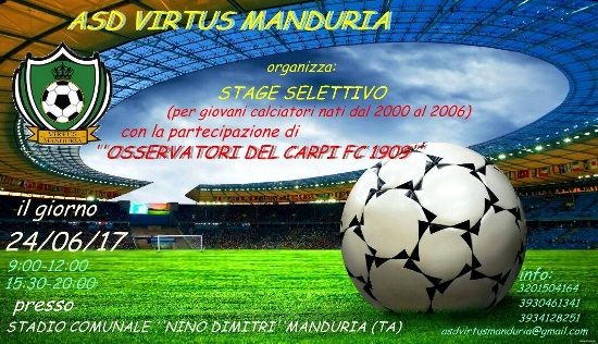 Lo stage calcistico selettivo si terrà presso lo stadio comunale “Nino Dimitri” di Manduria per tutta la giornata di sabato 24 giugno: dalle 9 alle 12 e dalle 15:30 alle 20. I due osservatori di caratura nazionale avranno l’obiettivo di visionare, valutare, opzionare giovani promesse calcistiche da inserire nell’organico di importanti società professionistiche nazionali.