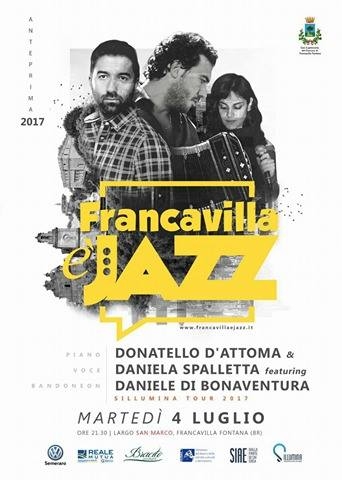 (voce) e lo special guest Daniele Di Bonaventura (bandoneon) saranno protagonisti dell’anteprima della IV edizione del festival Francavilla è Jazz, kermesse ideata dal brillante e competente direttore artistico Alfredo Iaia, che si terrà come di consueto a Francavilla Fontana. Martedì 4 luglio alle ore 21:30, nel favoloso scorcio di Largo San Marco, questo fascinoso trio presenterà un repertorio variegato comprendente brani tratti da D-Birth, album realizzato nel 2015 da Daniela Spalletta con la collaborazione degli Urban Fabula e dell’ospite Max Ionata, licenziato da Alfa Music, unitamente alle composizioni estratte da Shema’, disco a cura di Donatello D’Attoma, con la partecipazione di Daniela Spalletta,prodotto nel 2016 dalla medesima etichetta. D-Birth è un progetto discografico di matrice contemporary jazz, dal sound avvolgente, stilisticamente policromatico, ricco di spunti molto interessanti. Spontaneità espressiva e gusto narrativo sono le peculiarità predominanti di Shema’, lavoro dedicato affettuosamente a uno tra i jazzisti più influenti e controversi della storia: Charles Mingus. Pianista e organista sensibile, armonicamente creativo e ritmicamente accattivante, D’Attoma è un talento cristallino. Nell’arco della sua carriera ha condiviso il palco con numerosi musicisti di blasone internazionale, tra cui: Vladimir Kostadinovic, Marco Tamburini, Emanuele Cisi, Roberto Ottaviano, Giovanni Falzone, Massimo Manzi, Robertinho De Paula. Le sue inconfutabili qualità artistiche sono state apprezzate non solo in Italia, ma anche all’estero, specialmente in Germania e Polonia. Daniela Spalletta è una tra le cantanti jazz italiane più quotate della nuova generazione. È in possesso di un’adamantina agilità vocale, congiuntamente a un potente falsetto che rappresenta un tratto distintivo del suo background tecnico. Si è esibita riscuotendo successo anche fuori dai confini peninsulari, in Paesi come Stati Uniti, Francia, Spagna e Malta. Nel suo palmares figurano collaborazioni prestigiose al fianco di alcuni celebri e autorevoli musicisti jazz, tra i quali: Israel Varela, Enrico Intra, Riccardo Fioravanti, Nicola Angelucci, Chiara Civello, Giovanni Mazzarino, Fabrizio Bosso, Giuseppe Bassi. Di Bonaventura è uno tra i massimi esponenti europei del bandoneon. Maliarda cantabilità, profondo senso melodico ed estetico rappresentano gli autentici marchi di fabbrica dell’artista marchigiano. Ha calcato i palchi di tutto il mondo, estasiando gli astanti presenti ai suoi concerti. Inghilterra, Olanda, Egitto, Norvegia, Svizzera, Portogallo, Brasile, Argentina, Slovenia, Moldavia, Croazia, Lettonia, Albania, Singapore e Sud Africa sono solo alcune della nazioni nelle quali si è esibito. Nel corso della sua proficua e intensa attività concertistica ha suonato insieme a una miriade di artisti noti a livello mondiale, come: Toots Tielemans, David Liebman, Miroslav Vitous, Enrico Rava, Paolo Fresu, Stefano Bollani, Omar Sosa, Javier Girotto, Greg Osby, Ira Coleman, David Murray, Rita Marcotulli, Frank Marocco, Flavio Boltro, Furio Di Castri, solo per citarne alcuni. L’anteprima del Francavilla è Jazz 2017 promette spettacolo, grazie a un trio in grado di conquistare, attraverso una lodevole raffinatezza interpretativa e a una veracità comunicativa, un pubblico eterogeneo non necessariamente formato da jazzofili.