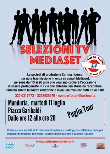 Grazie al supporto logistico della Pro Loco, arriverà alle 12 (per trattenersi sino alle 20) il camper di Corìma Produzioni, che ricerca persone spigliate dai 13 ai 90 anni o minorenni accompagnati dai genitori, che vogliano cogliere l’occasione di essere protagonisti in tv o che abbiano una storia personale da sottoporre all’attenzione dei selezionatori.