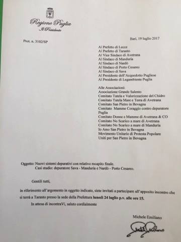 Il governatore sarà a Taranto il 24 luglio. Anche se sono stati invitati i sindaci di Manduria, Sava e Avetrana, non è questo l’incontro richiesto per discutere sulla possibilità di trovare nuove intese sul depuratore
