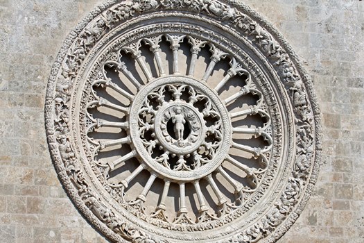 3) Le foto riproducono, nell’ordine, il rosone della Collegiata di Manduria (come si presenta attualmente e prima che avvenisse il distacco delle cd. cuspidi) e i rosoni delle Cattedrali di Ostuni e Altamura.