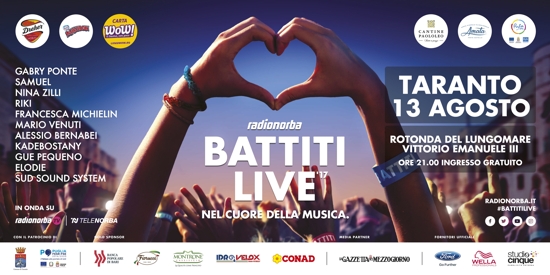 Dopo quattro esaltanti serate, con decine di migliaia di spettatori nelle piazze di Bari, Nardò, Andria e Melfi e milioni di telespettatori in tv tra i canali digitali e satellitari del Gruppo Norba e Italia 1 (senza contare i numeri in radio e su internet), Battiti Live si appresta a vivere un’ultima grande notte. Domenica prossima,13 agosto, anti vigilia di Ferragosto, è infatti in programma a Taranto il gran finale dello spettacolo di Radionorba. Un gradito ritorno per Battiti nel capoluogo jonico, dove è ancora vivo il ricordo del 2014, con il lungomare pieno in ogni suo angolo.