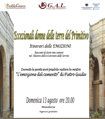 La prima serata è dedicata alla figure femminili che nelle terre del Primitivo hanno vissuto e grazie alla loro presenza hanno cambiato il corso degli eventi: sono figure di donne eccezionali per i tempi da loro vissuti e per il territorio che loro vivevano. Molto non vogliamo svelare per lasciare che la curiosità vi porti a partecipare alla prima serata di domani (13 agosto), ore 20, per un percorso fatto di racconti e di scoperte, che proprio per la grande attenzione che il maestro Pietro Guida ha dedicato alla figura femminile ha portato a unire “L’emozione del Cemento” con i racconti sulle donne delle Terre del Primitivo.