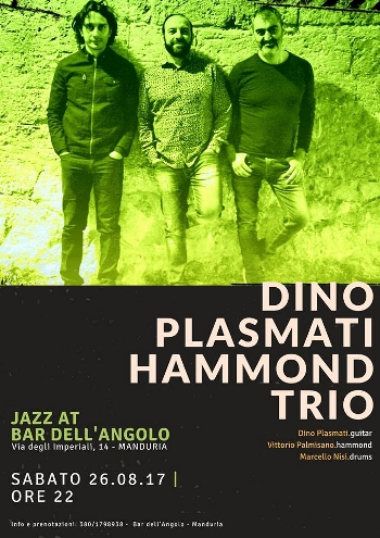 solco modern jazz, specialmente in orbita post-bop. Sabato 26 agosto, alle ore 22, la suggestiva cornice del bar dell’Angolo (Via degli Imperiali, 14 – Manduria) di Carmelo Massafra sarà lo scenario del concerto firmato Dino Plasmati Hammond Trio, costituito da Dino Plasmati (chitarra), Vittorio Palmisano (organo hammond) e Marcello Nisi (batteria). Il repertorio di questo live verterà su svariate composizioni originali autografate dal chitarrista lucano congiuntamente a un paio di brani siglati da due leggende del jazz come Thelonious Monk e Charles Mingus. Il fraseggio di Plasmati è fluente, spigliato, ricco, impreziosito da una godibile cantabilità e da un maliardo senso melodico. Durante la sua carriera si è esibito al fianco di numerosi jazzisti di blasone mondiale, tra i quali: Randy Brecker, Evan Parker, Steve Grossman, Bob Mover, Bobby Watson, Javier Girotto, Alfredo Paixao, Israel Varela, Pierre Favre, Paolo Fresu, Gabriele Mirabassi, Luciano Biondini. Le sue doti musicali sono state apprezzate anche fuori dai confini peninsulari, in nazioni come Germania, Grecia, Portogallo, Olanda e Galles. Palmisano è un pianista e organista di talento, legato alla tradizione jazzistica, ma al contempo particolarmente interessato al jazz contemporaneo. Nel corso della sua attività concertistica ha collaborato con diversi valenti musicisti, tra cui: Michael Rosen, Giovanni Angelini, Felice Mezzina, Paolo Magno, Michele Di Monte, Claudio Chiarelli. Un largo utilizzo della poliritmia e una ricercata modulazione metrica sono due elementi imprescindibili del drumming di Nisi. Il suo stile batteristico complesso, energico e mai oleografico, adornato da uno stimolante e tensivo spostamento degli accenti, è stato messo al servizio di uno stuolo di jazzisti assai prestigiosi e conosciuti a livello internazionale e nazionale, come: Benny Golson, Sonny Fortune, Frank Lacy, Henry Cook, Philippe Catherine, Miroslav Vitous, Martin Gjakonovski, Greg Burk, Ron Seguin, Robert Bonisolo, Bobby Watson, Michael Rosen, Antonio Faraò, Alessio Menconi, Paolo Di Sabatino, Aldo Vigorito, Martin Jacobsen, Luca Alemanno, solo per citarne alcuni. Le sue spiccate qualità gli hanno consentito di calcare il palco anche all’estero, ad esempio in Germania, Svizzera, Belgio, Galles, Russia, Montenegro e Albania.