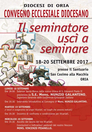 I lavori del convegno, dal titolo "Il seminatore uscì a seminare", si svolgeranno secondo il programma di seguito indicato e saranno introdotti dall'intervento di S.E. mons. Nunzio Galantino, segretario generale della Conferenza Episcopale Italiana.