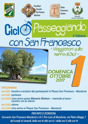 Manduria, in collaborazione con l’A.T. Pro Loco di Manduria, organizzano la terza edizione de “CICLOPASSEGGIANDO CON SAN FRANCESCO”, una giornata all’insegna della natura in occasione della festa del patrono d’Italia e dell’ecologia.