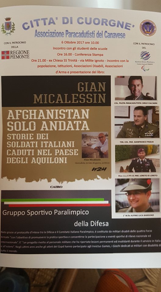 stimolo, un incoraggiamento per giovani e meno giovani che troppo facilmente si arrendono di fronte alle piccole difficoltà della vita. L’assessorato alla Cultura e Politiche sociali cuorgnatese, in collaborazione con l’associazione Paracadutisti del Canavese, l’associazione Enzo D’Alessandro ed il patrocinio della Regione Piemonte e del Comitato italiano paralimpico, ha organizzato nei giorni scorsi un evento che ha visto fra i protagonisti il tenente colonnello paracadutista Gianfranco Paglia, il colonnello paracadutista pilota Carlo Calcagni e il primo maresciallo paracadutista Simone Careddu. Tutti militari, accomunati da un destino beffardo: essere stati feriti in battaglia e vedere la loro vita cambiare improvvisamente a causa della disabilità. Ma, soprattutto, uomini straordinari che hanno incontrato il buio e ne sono usciti, hanno saputo rialzarsi da ogni caduta.