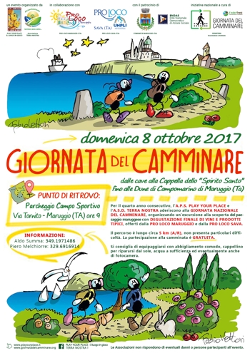 A Maruggio la manifestazione è organizzata dalle associazioni “Play your Place” di Maruggio e “Terra Nostra” di Sava. La passeggiata proporrà un itinerario che toccherà le antiche cave di tufo e la cappella dello “Spirito Santo” fino alle dune di Campomarino.