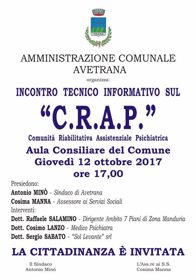 terrà questa sera, alle 17, nell’aula consiliare. I lavori saranno aperti e moderati dal sindaco Antonio Minò e dall’assessore ai Servizi Sociali Mimma Manna. Sono poi previsti gli interventi di tre esperti, ai quali è affidato il compito di illustrare alla cittadinanza come funziona il “C.R.A.P.”: si tratta di Raffaele Salamino, dirigente del Piano Sociale di Zona di Manduria; di Cosimo Lanzo, medico psichiatra; e di Sergio Sabato, in rappresentanza della “Sol Levante” srl.