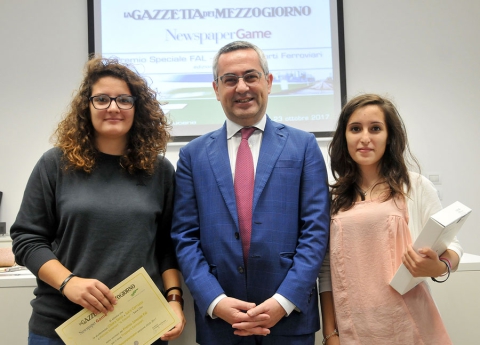 Il premio speciale Fal-Newspapergame Blog Trasporti è stato consegnato ieri mattina nella bella sala formazione del deposito Fal di Bari scalo. I vincitori: Michele Tritone, I E della scuola secondaria di I grado Amedeo d’Aosta di Bari; Chiara Dinoi e Sara Carrozzo dell’istituto superiore Falcone di Sava; Rocco Pio Primavera della scuola secondaria di I grado di Pignola, in provincia di Potenza. A ciascuno dei vincitori il presidente delle Ferrovie Appulo Lucane, Matteo Colamussi, ha consegnato un tablet. Alle scuole di appartenenza andranno invece in dono monitor interattivi.