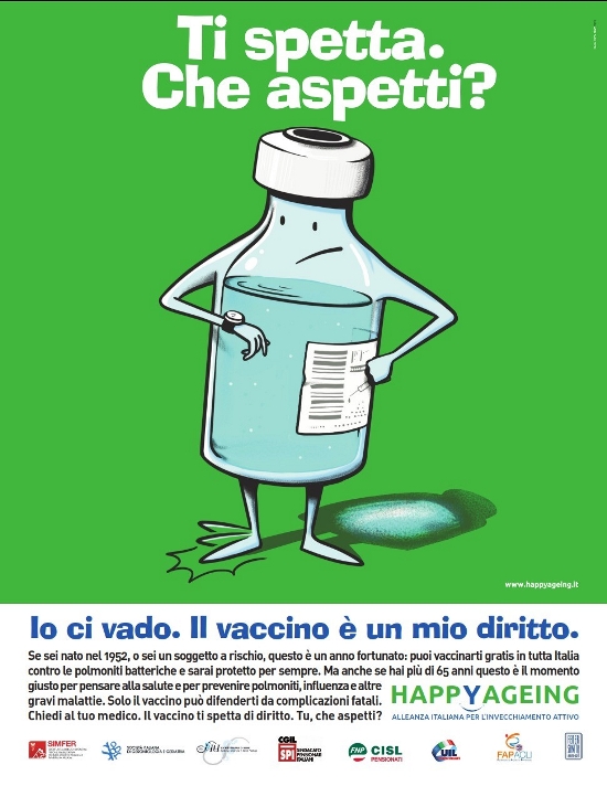 “Ogni anno, in Italia, sono migliaia i decessi e i ricoveri ospedalieri per complicanze derivate da malattie evitabili grazie a un vaccino come polmoniti batteriche, influenza o herpes zoster, quasi tutti anziani – ha voluto ricordare Michele Conversano, presidente di HappyAgeing in occasione del lancio della campagna – In particolare, la polmonite è ancora la prima causa di morte per malattie infettive nei Paesi occidentali. Se si abbinasse la vaccinazione antinfluenzale al vaccino anti pneumococco, si potrebbe arrivare a ridurre il numero di decessi fino anche del 60%. Far conoscere questo diritto ed esigerlo in tutta Italia è un dovere civile verso sé e verso la collettività”.