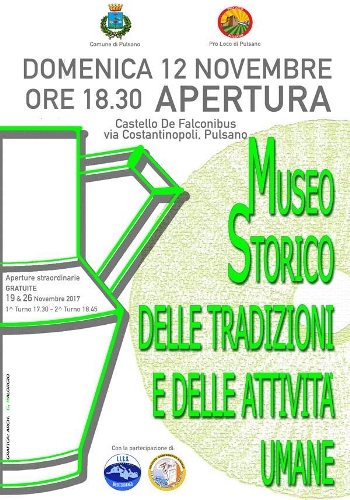 terrà domenica, alle ore 18.30. In una nuova location, presso il primo piano del Castello De Falconibus e soprattutto in una veste del tutto rinnovata. L’organizzazione del Museo, infatti, è stata curata nei minimi particolari dalla locale Pro Loco e dai volontari esperti in archeologia che hanno collaborato sotto la guida di Luca Adamo. Il museo ospita reperti della tradizione contadina con spazi dedicati alla olivicoltura, viticoltura ed alla coltivazione del grano. L’etichettatura dei reperti nel dialetto locale favoriranno la tutela della memoria storica ed immateriale dell’identità agricola e marinara del comune di Pulsano. La fruizione del museo sarà destinata a tutti, residenti e turisti e soprattutto alle scuole primarie e secondarie di tutta la provincia ionica.