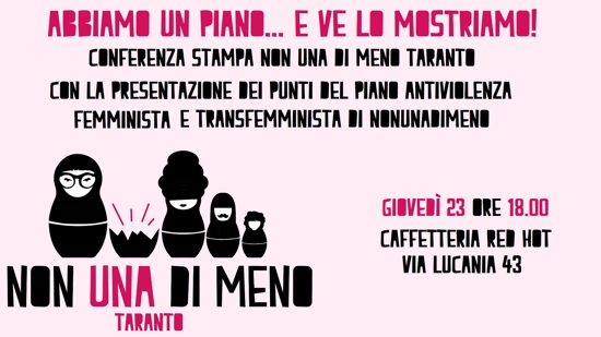 Il 23 novembre a Taranto (alle ore 18, presso la caffetteria Red Hot, in via Lucania 41-43), come in diverse altre città italiane, Non Una di Meno presenterà il Piano femminista, uno strumento di analisi e politico, che considera la violenza maschile sulle donne e di genere come fenomeno strutturale e sistemico e che nasce a partire dalla messa in rete delle esperienze dei centri antiviolenza e del movimento femminista.