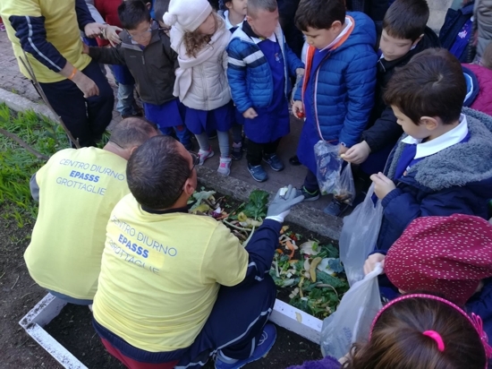 Poi, complice una splendida giornata di sole, tutti si sono trasferiti all’aperto per sistemare il piccolo impianto di lombricompostaggio e l’attiguo orto utilizzando l'aiuola più grande della scuola, con l’assistenza “sul campo” di alcuni disabili del Centro Diurno EPASSS di Grottaglie: i bambini hanno portato i rifiuti organici da casa e hanno potuto assistere all’allestimento dell’impianto di lombricompostaggio.