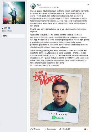 del nuovissimo brano del poliedrico musicista italiano J-AX dal titolo “Devi morire”, un brano autobiografico contro il bullismo.