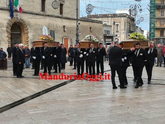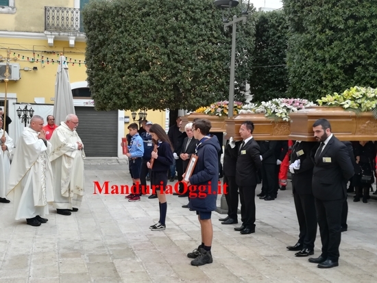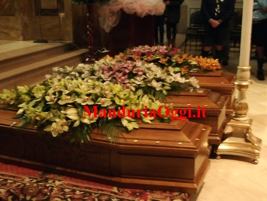 Chiesa gremita davanti alle tre bare, allineate ai piedi dell’altare: Damiano a sinistra, Nella al centro e Salvatore a destra. Su ognuna delle bare le rispettive foto. Le salme sono arrivate a Sava intorno alle 9,30. Con la chiesa ancora vuota, ha dato l’ultimo saluto ai suoi genitori e al nonno anche il piccolo Alessandro, accompagnato da una cugina, alla quale è in affidamento: davanti alla sconvolgente realtà e con un episodio che segnerà per sempre la sua vita, il viso di Alessandro, poco più di 10 ani, è stato solcato da rigagnoli di lacrime.