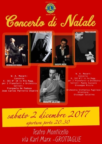 Saranno eseguite musiche di W. A. Mozart. Pierpaolo de Padova e Joao Carlos Parreira Chueire saranno i solisti del concerto K 365 numero 10 in Mi bemolle Maggiore per due pianoforti e orchestra. Paolo Cuccaro e Giuseppe Riccio saranno i solisti del concerto K 242 numero 7 in Fa Maggiore per due pianoforti e orchestra.