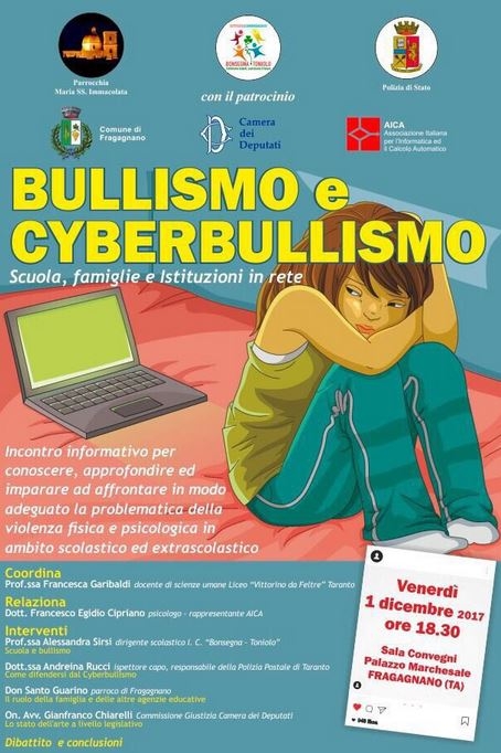 L’iniziativa è stata promossa dalla parrocchia Maria SS. Immacolata, in collaborazione con l’istituto comprensivo “Bonsegna – Toniolo”, la Polizia di Stato e con il patrocinio del Comune di Fragagnano, della Camera dei Deputati e dell’Aica (Associazione Italiana per l’Informatica e il Calcolo Automatico). Una tavola rotonda con al centro il mondo della scuola, le istituzioni e le famiglie. Tre agenzie educative e formative insieme in modo sinergico per cercare di arginare i diffusi fenomeni del bullismo e del cyberbullismo, oramai quasi all’ordine del giorno, mettendo in campo una serie di misure preventive e di controllo.