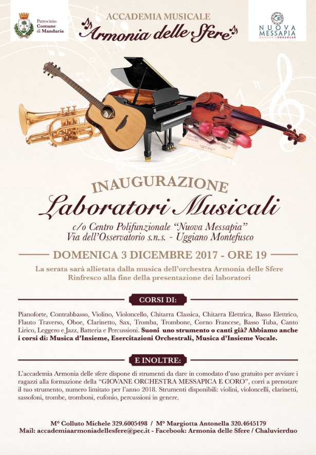 L’Accademia Armonia delle Sfere, dopo avere ottenuto l’approvazione del progetto presentato in occasione del bando di gara, ha stipulato una convenzione con il Comune di Manduria al fine di avviare i laboratori musicali nel centro. Uno degli obiettivi dell’accademia è quello di costituire la “Giovane orchestra e Coro Messapica”: per incentivare tale scopo ed andare incontro alle esigenze delle famiglie, l’accademia ha acquistato strumenti musicali da dare in comodato d’uso gratuito. Gli strumenti disponibili sono violini, violoncelli, clarinetti, sax, trombe, tromboni, eufonio e percussioni. I corsi musicali e corali saranno tenuti da maestri professionisti, specializzati nei vari strumenti.