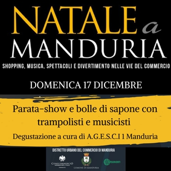 Il mese di dicembre avanza e con esso anche gli appuntamenti di “Natale a Manduria”, l’iniziativa promossa dal D.U.C. di Manduria (Distretto Urbano del Commercio) in collaborazione con il Comune di Manduria e le sedi locali di Confcommercio e Confesercenti.