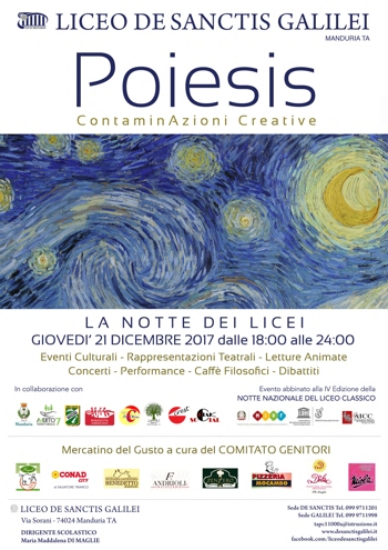 «In questa magica serata chi avrà il piacere di unirsi alla nostra festa potrà godere di momenti di intrattenimento culturale, diversi e veramente coinvolgenti, all’insegna dell'apprendimento ludico e del calore dello stare insieme» raccontano Matteo D’Aloja e Flavia Dinoi, giovani componenti della redazione del giornale “@ Zonzo” del liceo manduriano. «L’avvio dell’evento sarà, quest’anno, segnato da un’importante cerimonia di inaugurazione: dopo un anno di accurato restyling, ad opera degli studenti liceali impegnati nel percorso di “Alternanza Scuola Lavoro”, si apriranno le porte delle due biblioteche del nostro liceo, rispettivamente nella sede De Sanctis e nella sede Galilei».