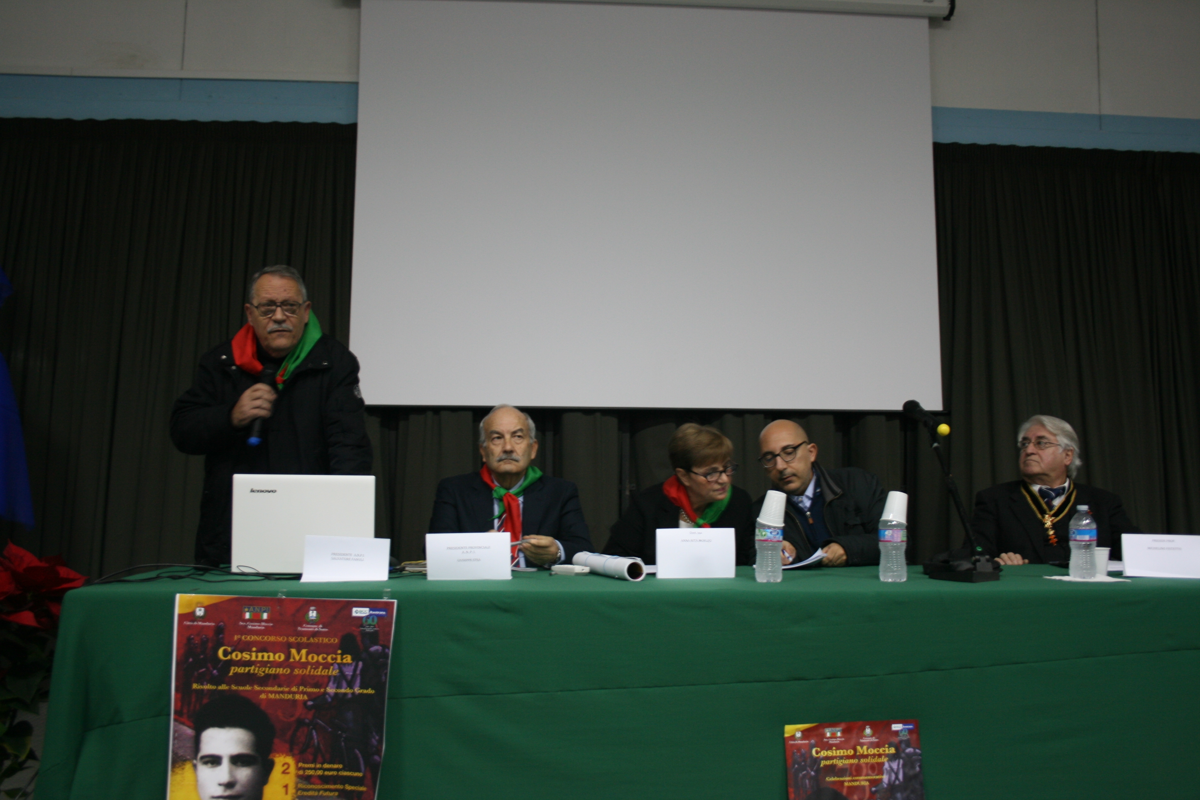 Aperta e moderata da Giuseppe Dimagli, nipote di Cosimo Moccia (ha rivelato una serie di aneddoti non conosciuti sulla vita e sulla figura del “partigiano-eroe”), la commemorazione del carabiniere manduriano ha registrato i saluti della dirigente scolastica del “De Sanctis-Galilei”, Maria Maddalena Di Maglie, e del presidente della sezione ANPI di Manduria, Salvatore Fanuli. E’ poi proseguita con un appassionato intervento di Anna Rita Morleo: l’operatrice culturale mandurina ha dedicato, alcuni anni fa, un libro a Cosimo Moccia, frutto di ricerche storiche e di interviste realizzate a Tramonti di Sotto a gente del posto.